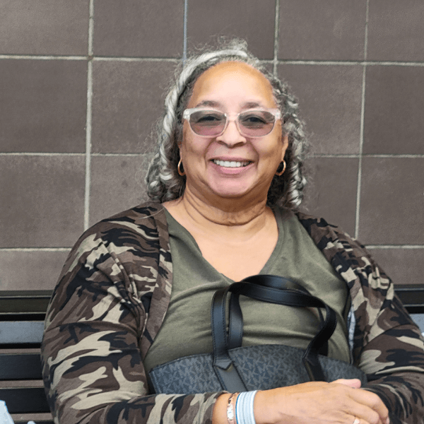 Ethel smiling and wearing a black dress, seated in a relaxed indoor setting.